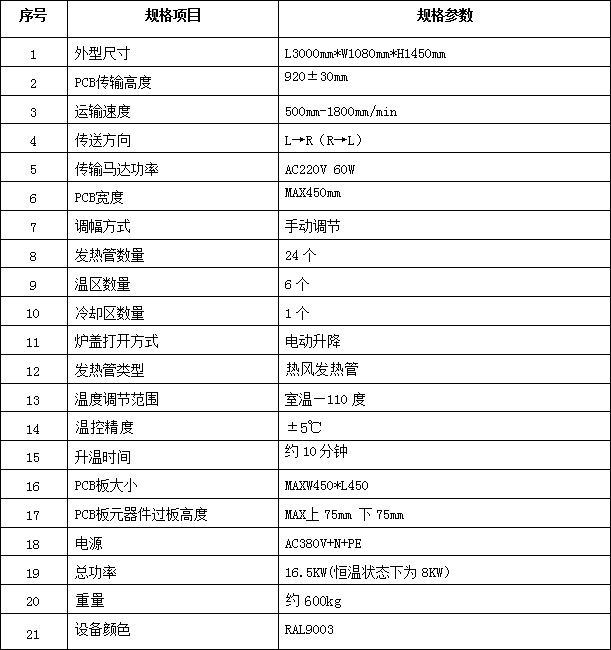 6.加热管:使用热风式加热管,总功率14.5KW,均匀安装,设备分6个温区;